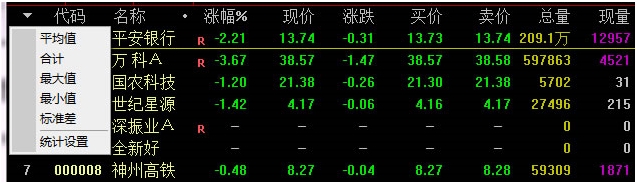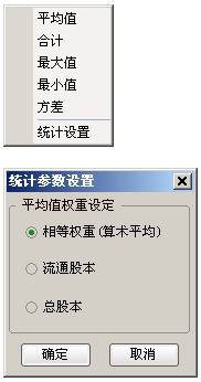 7、按照“平均值”、“合计”、“最大值”、“最小值”、“方差”五种统计方式显示当前行情栏目的所有数据,同时可以使用“统计设置”进行设置