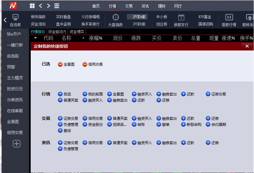 2、主菜单条的右端有两组按钮,分别控制系统窗口和其子窗口的最小化、层叠/还原、关闭。该系统支持整屏放大功能,整个界面就像在DOS下一样;主菜单左边有4个按钮,从左到右分别代表左侧面板、后退、前进、工具面板。其中左侧面板提供了定制我的快捷按钮的特色功能,如下: