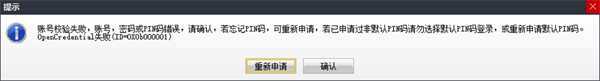 注意:手动设置PIN码和“默认PIN码”申请的证书不可混用! 如已通过“默认PIN码”申请过证书,切换手动设置PIN码前需将原有证书注销后方可申请新证书;反之,手动设置PIN码申请过证书的,也要注销原有证书方可使用“默认PIN码”申请新证书。否则会出现如下报错: