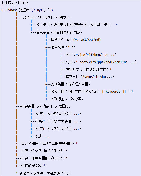 mybase desktop 8软件支持创建一个或多个数据库,每个数据库对应生成一个 .nyf 文件,其中以树形大纲形式存储用户输入的各项资料内容,每个大纲条目可存储一篇文本内容,同时可存储一个或多个附件文档或图片; 不同大纲条目之间可建立双向链接相互关联;支持自定义标签,可对大纲条目再次进行分类;下面知识库内部信息组织结构示意图可供参考: