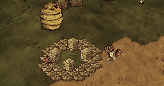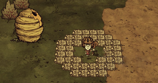 这是目前最主流的打法。但这是老奶奶专属。需要准备的材料有石墙两组,触手书至少5本。首先建造一圈边长为6的正方形石墙(共20石墙),然后在外围对齐中间四个墙建造第二排石墙(共16石墙)。之后用武器把这些墙打平,然后在正方形内层的4个角各放一个石墙(4石墙),打平。正好两组石墙用完。