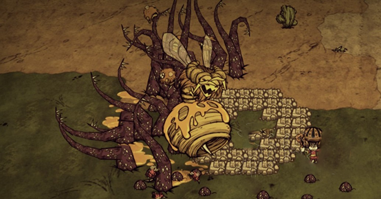读完触手书用锤子把蜂王敲出来,然后从触手上走一遍把触手引出来,蜂王在后面就会被一堆触手打。如此循环直到打死。打完捡战利品的时候切记不要贪,没有手杖老老实实捡一走,有手杖可以捡二走。
