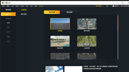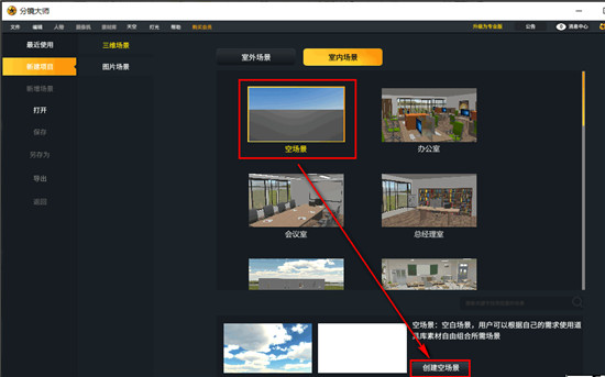 5、由于复杂的场景需要使用的CPU比较多,这里选择空场景做演示,选择其它场景的时候注意电脑性能是否支持,否则会造成电脑卡顿。