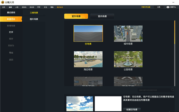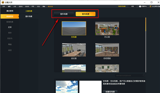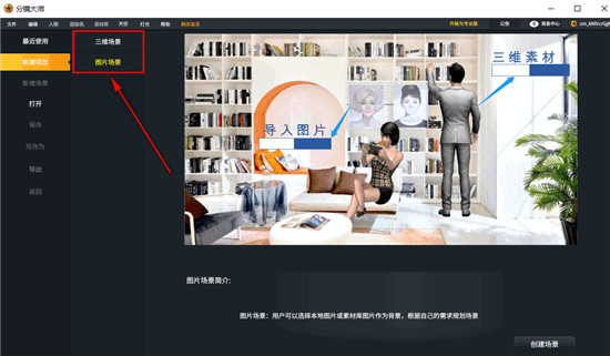 3、选择新建项目,它支持图片场景和三维场景,您可以在此切换。