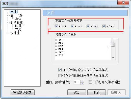 2、要预览字幕文件,必须在安装时或通过SrtEdit的设置选项将该类型的文件与SrtEdit关联,可通过下面两种方式实现: