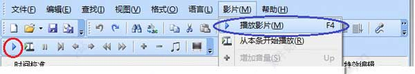 7、当 SrtEdit 已打开一个字幕文件,且在该字幕文件同一路径下存在同名的(扩展名不同)影片文件,按工具栏上的播放按钮(下图中红色圆圈标示处)或主菜单“影片”-〉“播放影片”(下图中蓝色椭圆标示处),即可打开该影片并开始播放,以便开始校准工作,如下图所示: