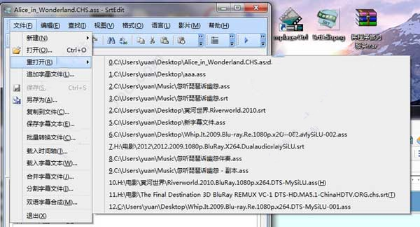 4、如果需要打开已经编辑过的字幕文件,可以选主菜单“文件”-〉“重打开”,可列出最近编辑的若干个字幕文件(其最大数量可在主菜单“视图”-〉“选项”-〉文件页中的“重打开菜单行限制”处修改,默认为30),在该列表中的文件所有属性都被SrtEdit 所保存,所以在这里打开的文件不会出现乱码。