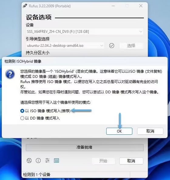 4、选择「以 ISO 镜像模式写入」,然后点击「OK」。