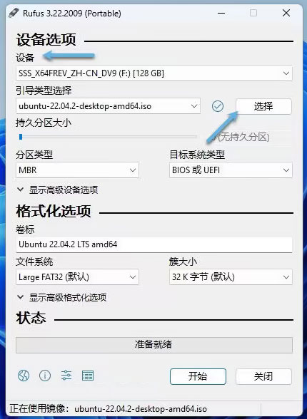 2、运行 Rufus,从「设备」下拉菜单中选择你的 U 盘,「选择」Ubuntu ISO 文件。