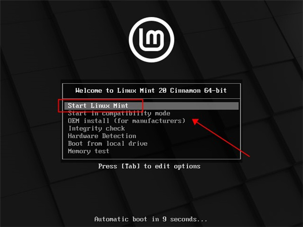 1、系统启动后,在 Grub 菜单中选择「Start Linux Mint」并按回车