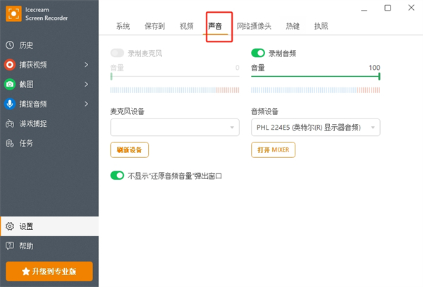 答:冰淇淋屏幕录屏默认录制系统声音。要确保它确实如此,请检查“程序设置”>“音频”