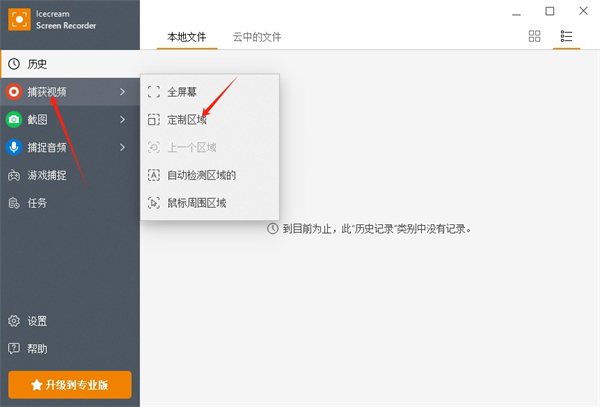 4、全部设置好后,点击捕获视频,选择好全屏区域、自动检测区域、鼠标周围区域、定制区域等,我们点击定制区域;