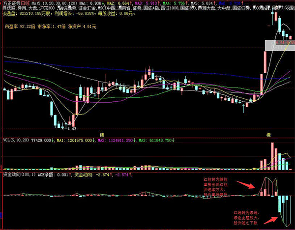 当红柱长度变短,红线变绿线持续向下时,说明大资金获利回吐迹象明显,此时应逐步逢高减仓;当红柱变绿柱,绿线持续向下时,说明活跃大资金整体以卖出为主,股价下跌风险较大,此时应注意规避风险。直到兰柱长度减小,绿线翻红。