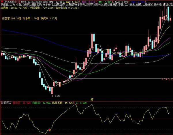 b)当黄色实线上穿进入风险区(绿色点状线),表示股价已经超涨,该区域风险加大,不宜追高;