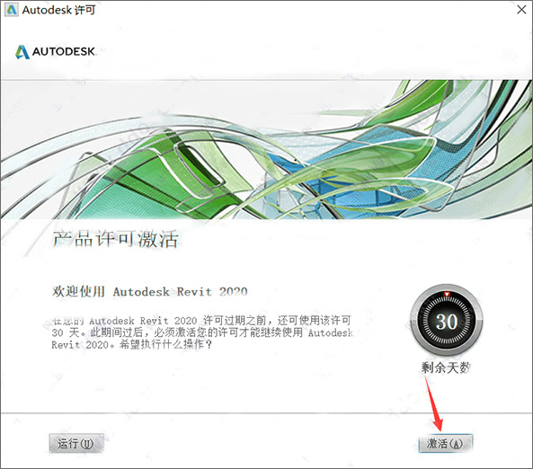 9、30天的试用期,点击激活按纽开始revit2020软件;