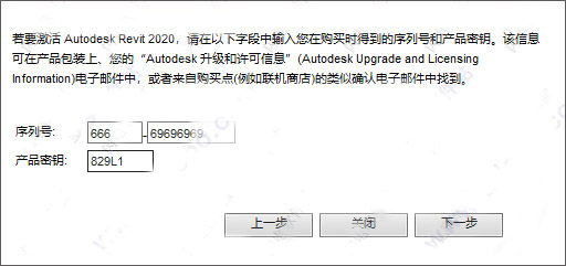 10、输入revit2020序列号【666-69696969】和密钥【829L1】,点击下一步继续;