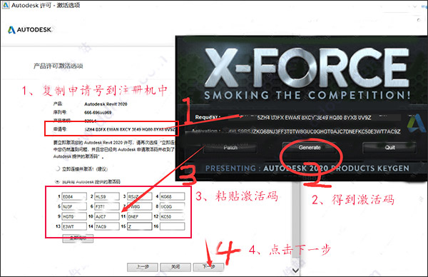 15、这里将申请号复制到注册机request中,再点击generate得到激活码,再将激活码复制到软件注册框中,点击下一步即可激活;
