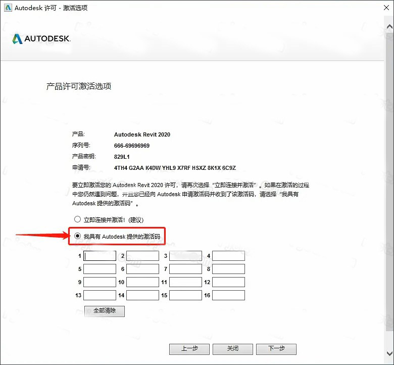 13、重新打开revit2020软件,继续11步、12步操作,重新进入注册界面,选择“我具有autodesk提供的激活码”显示如下: