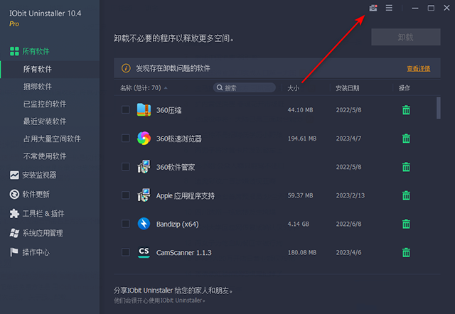 1、当我们需要使用到IObit Uninstaller软件时,那么我们就要将该软件点击打开,进入到该软件的操作页面中,然后将鼠标点击一下右上角箭头所指的图标位置进行点击一下。