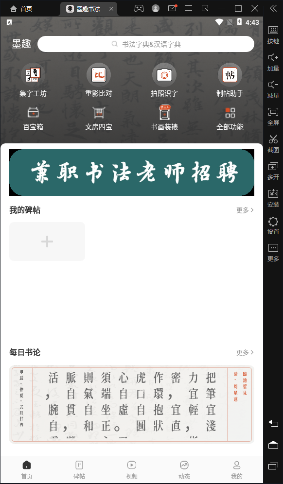《墨趣书法电脑版》是一款专为书法爱好者打造的学习交流神器,通过安卓模拟器在电脑端运行,功能强大又方便实用。它汇集了碑帖单字、重影比对、书法视频等丰富资源,还支持上传自己的作品与他人分享,欣赏优秀书法,更有达人榜评选书法高手。软件特色包括经典碑帖单字配米字格、手机扫描临字比对找差距、搜字集字便捷高效、精华书法视频教程等。新增功能如碑帖单字书写动态和墨客争霸答题竞赛让学习更有趣,优化后的使用体验也更好。无论是书法小白还是进阶高手,都能在这里找到适合自己的学习资源和交流机会,特别推荐给刚开始学书法的朋友,能帮他们快速提升!