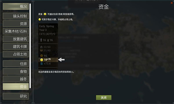 左边的面板会显示每回合的资金和收入。
