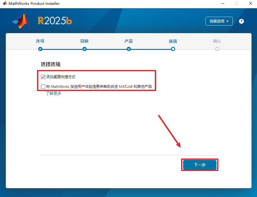 9、勾选【将快捷方式添加到桌面】,取消勾选【通过向MathWorks公司...】,点击【下一步】。