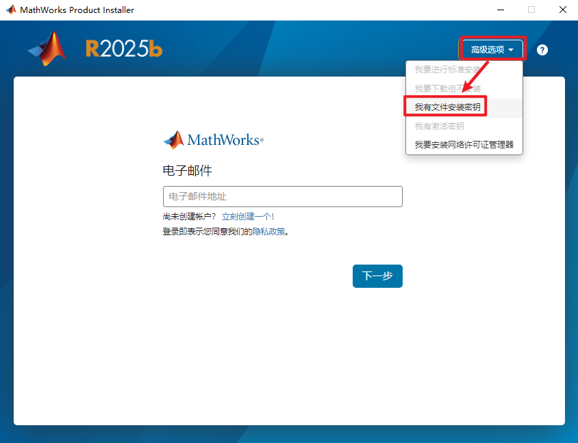 3、点击右上角【高级选项】,选择【我有文件安装密钥】。