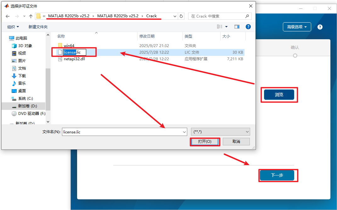 6、点击【浏览】,找到安装文件夹,打开【Crack】文件夹,选中【license.lic】文件,点击【打开】,点击【下一步】(路径不要有中文)。