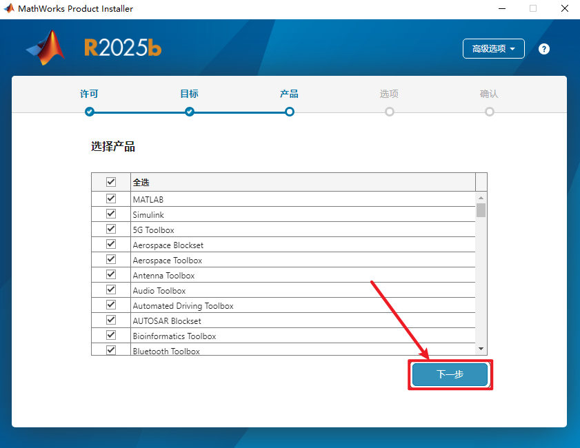8、根据需要选择安装产品,点击【下一步】。