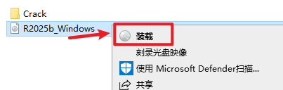 1、选中【R2025b_Windows.iso】文件,右键选择【装载】。