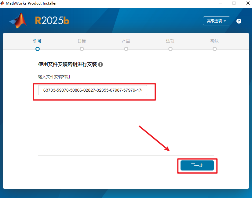 5、输入安装密钥:【63733-59078-50866-02827-32355-07987-57979-17850-05492-24096-05227-42839-55624-20610-22640-51189】,点击【下一步】。