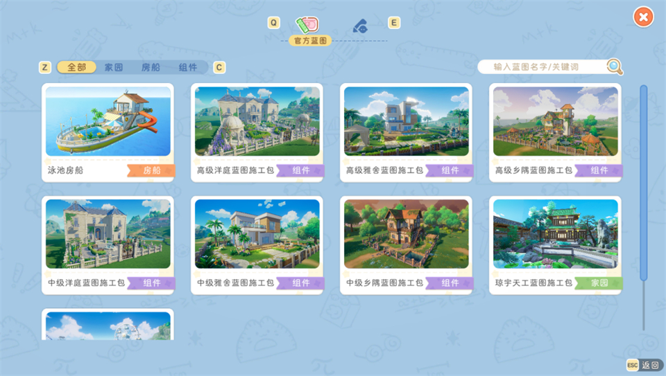 如果你渴望快速安家或需要灵感启发,我们的蓝图系统将是得力助手。游戏内预设了中式庭院、欧式别墅、豪华游乐园等8张风格各异的完整家园蓝图,集齐材料即可一键生成梦想之家。你也可以将自己精心搭建的家园保存为个人蓝图,方便在自己的不同存档中使用与回味。