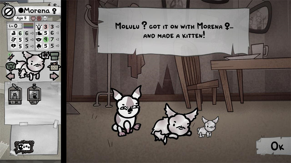 猫咪可能会带着伤和经验回家,有时候还会多出几颗脑袋!把古怪的技能和突变传下去,倒腾猫咪的种系,研究怪异的遗传特性,为下一次冒险培养更怪、更强的喵喵。