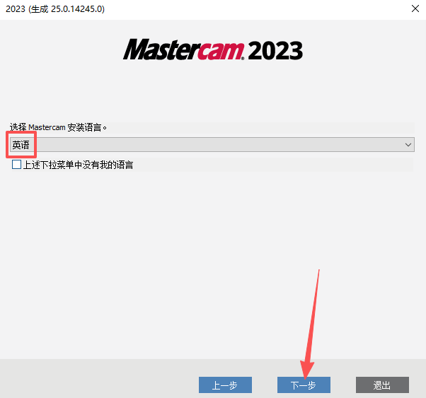 4、点击【下拉符号】选择【英语】,点击【下一步】。
