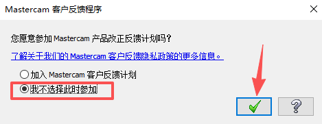 26、双击桌面【Mastercam2023】图标启动软件,选择【我不选择此时参加】,然后点击【√】。