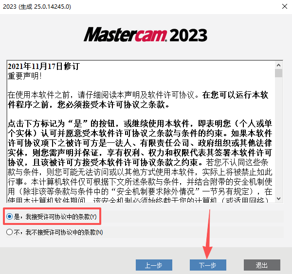 8、选择【是,我接受许可协议中的条款】,点击【下一步】。