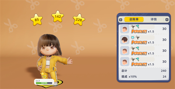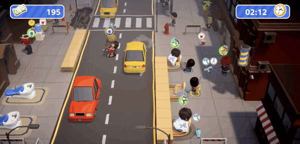 游戏的底层逻辑非常简单粗暴——搞钱,然后过关。虽然是个“乱来”的游戏,但流程得按规矩来。你需要和队友配合完成洗剪吹的一条龙服务。服务完一个客人后,你会获得不同的报酬(这取决于你让客户等了多久,千万别让他不耐烦了)。你的目标是在有限的关卡时间内,通过快速服务赚取足够的报酬,达到目标金额才能解锁下一关卡。