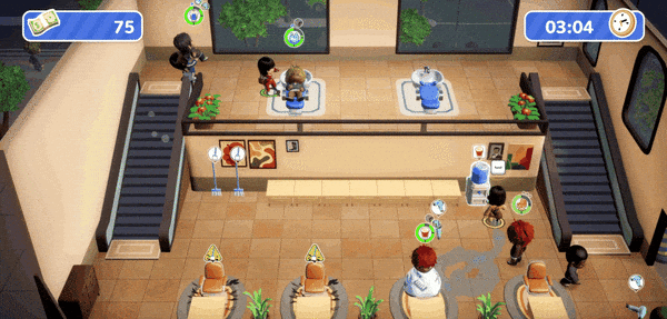 随着难度提升,你也可以利用不同角色的专属技能(比如有人移速快,有人擅长安抚客户,有人能让客户吃东西速度变快)来应对混乱。