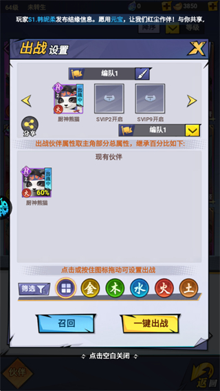 2、伙伴激活后即可出战,玩家可在出战设置界面选择自己的出战伙伴,出战位置随玩家转生等级或SVIP等级开放。