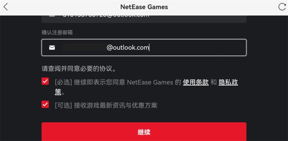 5、输入你的邮箱,并勾选下方两个协议,点击【继续】。