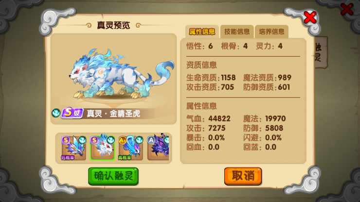 3、第三步就是使用a+级真灵 跟 a级老虎 来合成s级金晴圣虎。这也是合成s+白虎最难的一步,因为你即使用了绝品保证出s级真灵,也有50%的概率歪其他的,运气不好可能四五个s都出不了白虎。如果成功合出了白虎呢,那么和s+就很简单了。萌新可以直接用s虎跟a+和白虎就行了(a+别用猴子、乌龟)