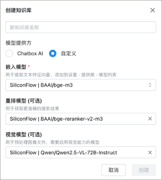 视觉模型:可选,配置之后,可以往知识库里添加图片,图片中的文字会被提出来入库
