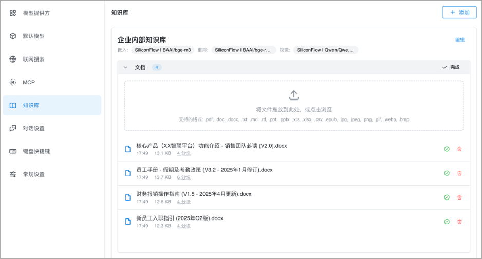 创建新对话,在输入框里的工具栏选择刚刚创建的知识库