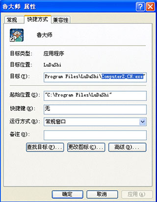 属性页面中,留意一下“目标”指向的最后一节,是不是\ComputerZ_CN.exe 结尾(如果不是,那么请提高警惕,这个鲁大师图标可能是假的):