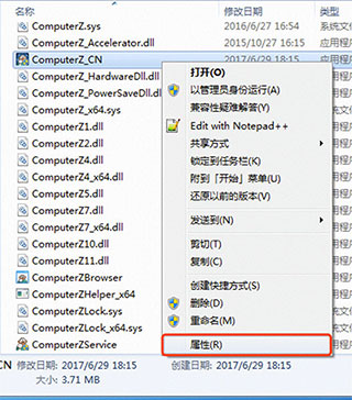 右键点击被自动选中的“ComputerZ_CN” 或 “ComputerZ_CN.exe”,选择“属性”,如下图所示: