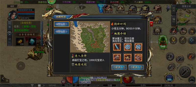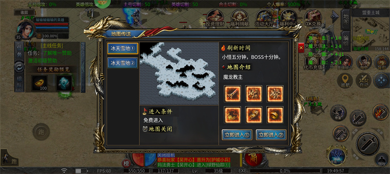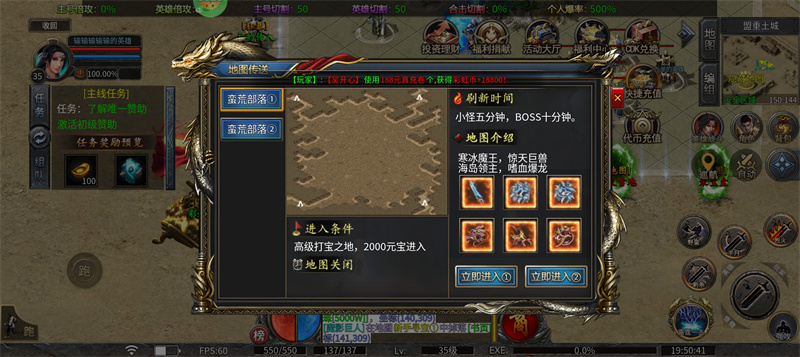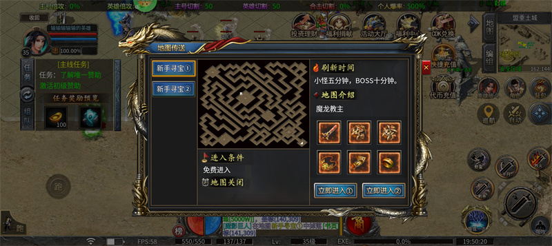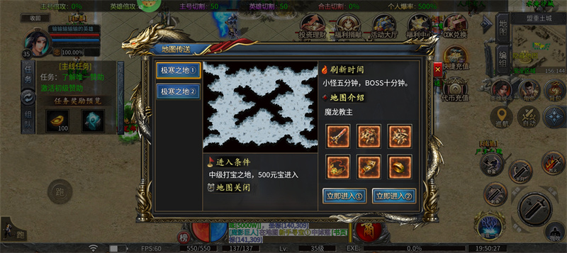 BOSS刷新点攻略方面,冰天雪地、新手寻宝等地图的魔龙教主可以免费进入,极寒之地需要500元宝,绿野仙踪和蛮荒部落则分别需要1000和2000元宝。游戏特色包括个人首爆、全服首爆、实物兑换和新区献礼活动。