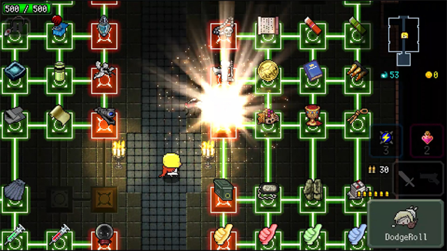 炸裂树莓浆游戏整体节奏还算是比较快地,玩起来感觉有些爽快。玩法跟传统地牢类游戏,特别是同类型的带有roguelike元素的2D射击游戏差不多。所有关卡中的地图全都是随机生成,人物能够携带近战武器和远程武器两种,在流程中玩家可以通过收集怪物掉落的以及开宝箱获得的宝物提高角色的属性。