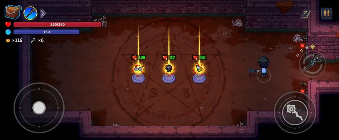 钥匙可以打开游戏内上锁的箱子或者房间内刷新的侧门,上锁箱子内会有各种随机奖励,包括法术、遗物、金币、水晶、生命、护盾、药水甚至钥匙本身。侧门内会有各种小游戏,包括但不限于:弹球机、大转盘、一笔画、躲飞刀等等,完成游戏也可以获得一定奖励。需要注意的是,第三章和第四章的侧门游戏难度会比第一章和第二章略高一些,奖励也会好一些,如果能稳定推进到第三章或第四章,最好在身上保留一些钥匙。