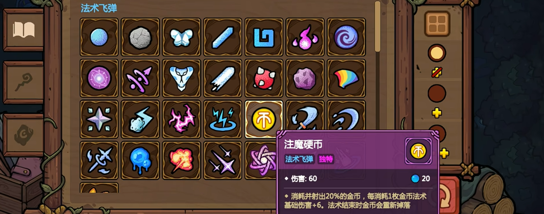 其中,金币可以让我们使用【重筑炉】重铸法术或在【商店】中购买法杖、法术、药水等道具,金币还会与部分遗物和某个独特法术联动,例如【淘金镐】会根据我们持有金币的数量增上;【淘金者软甲】可以让我们在拾取金币时回复对应数量的生命值;【淘金者金杯】会根据我们持有金币的数量发放“利息”。在游戏过程中,我们最好精打细算,厚积薄发,把钱花在刀刃上。