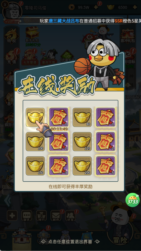 保持在线即可定时领取元宝、招募券,零成本积累核心道具。